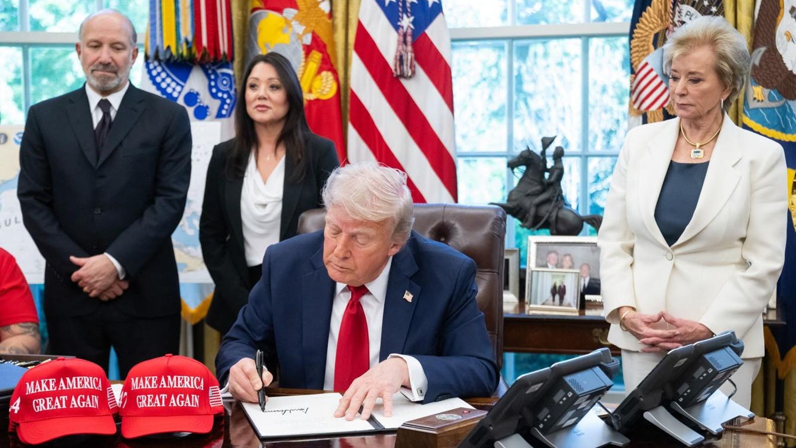 US President Donald Trump speaks to the media after signing executive orders relating to higher … More