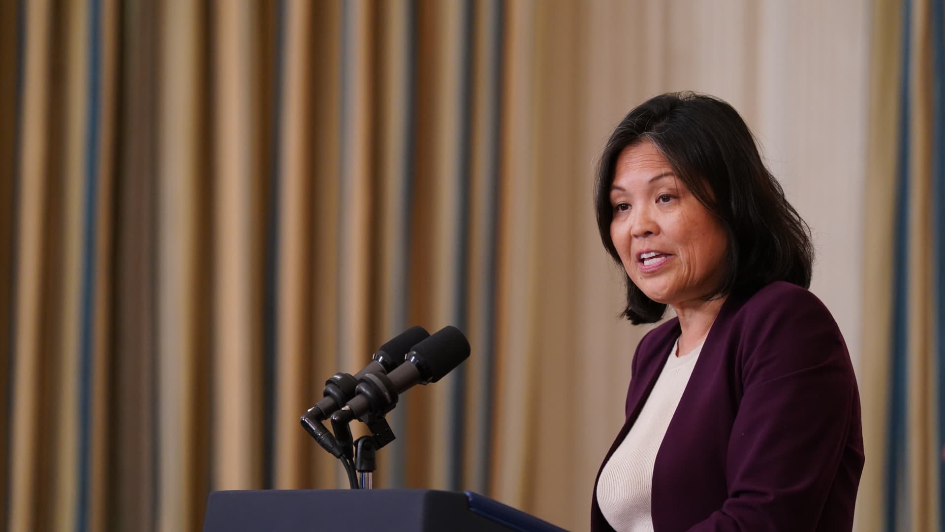 Julie Su, acting U.S. secretary of Labor, speaks during an event in the State Dining Room of the White House on Oct. 31, 2023. President Joe Biden announced a highly anticipated US Labor Department rule that would broaden the kinds of retirement advice subject to strict fiduciary standards under federal benefits laws.